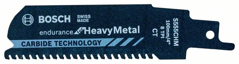 Сабельное полотно по металлу Bosch Endurance for HeavyMetal, Carbide Technology S 555 CHM изготовлено из HM (Carbide Technology). Имеет постоянный шаг зубьев 3 / 8 [мм]/TPI. Предназначено для резки высококачественных сталей (4-12 мм). Для самых тяжелых работ.