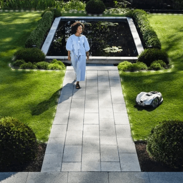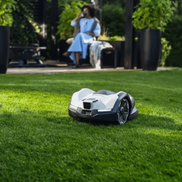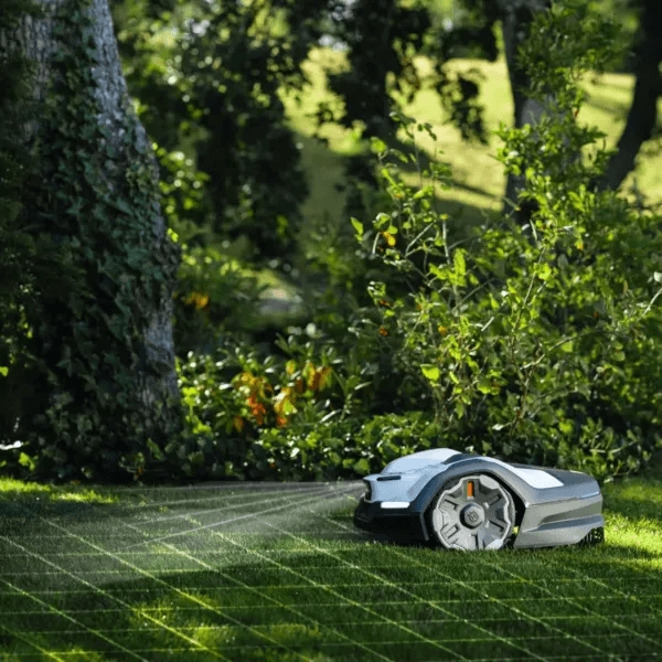 - Работает на склонах до 30%, тихая работа (60 дБ), автоматический возврат на зарядку.