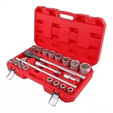 КомплектаціяТорцеві головки 3/4": 19, 20, 22, 23, 24, 26, 27, 28, 30, 32, 34, 36, 38, 41, 46, 50 мм - 16шт.; Подовжувач 3/4": 100 мм; Подовжувач 3/4": 200 мм; Тріскачка з реверсом 3/4" 24T: 500 мм; Вороток 3/4": 500 мм; Ударостійкий кейс.
